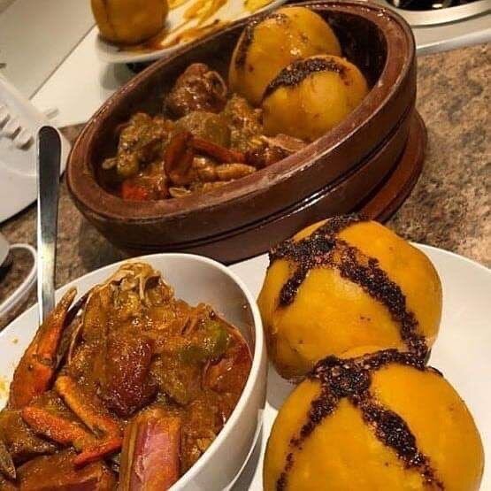 Découvrez notre Foufou servi avec une soupe combinaison savoureuse de crabe, poisson fumé , pattes de bœuf