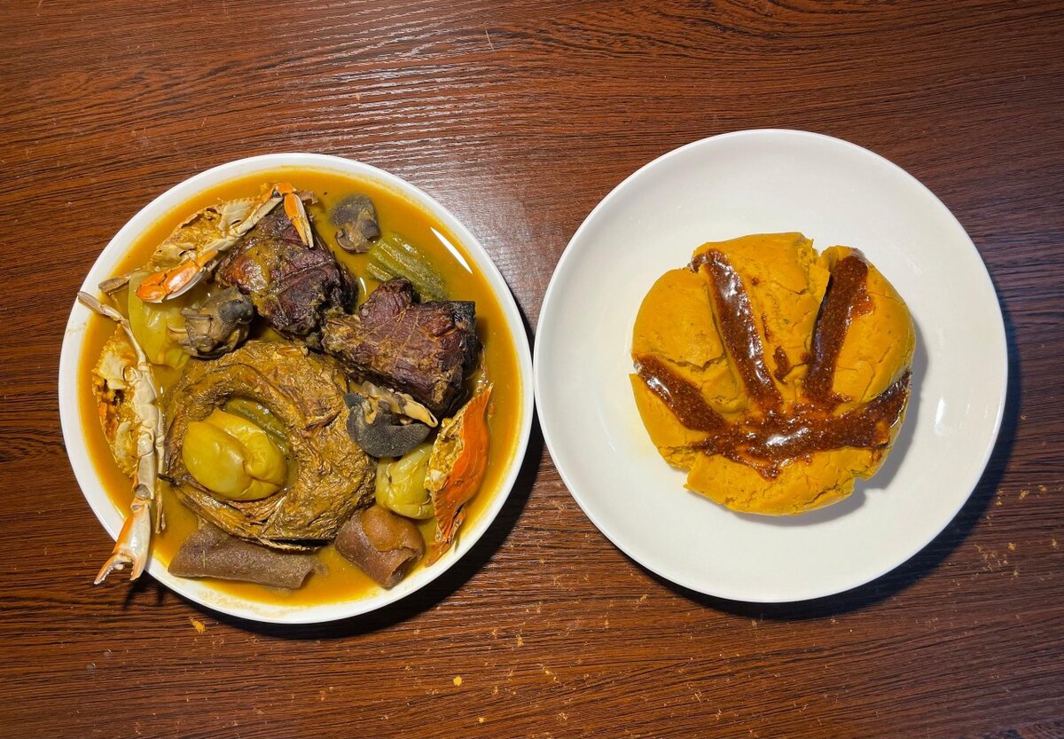 Savourez notre foufou adjoukrou, délicieusement préparé avec une sauce épicée contenant du poisson brochet, du crabe, du kplo et de la viande de bœuf fumée.