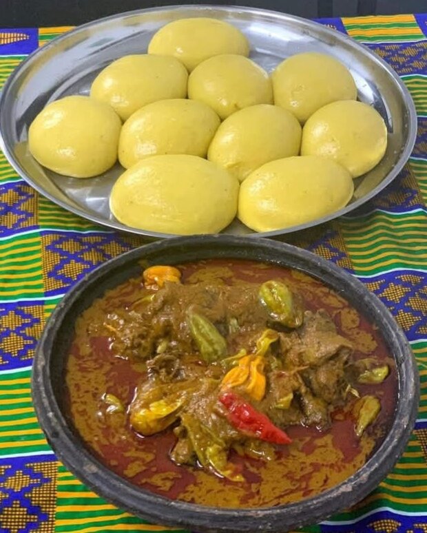 Foutou banane sauce graine. Vous avez le choix de prendre ce que vous aimez Poisson frais ou fumé,tripes, viande de boeuf, Patte de boeuf NB: c est 2 pains de foutou