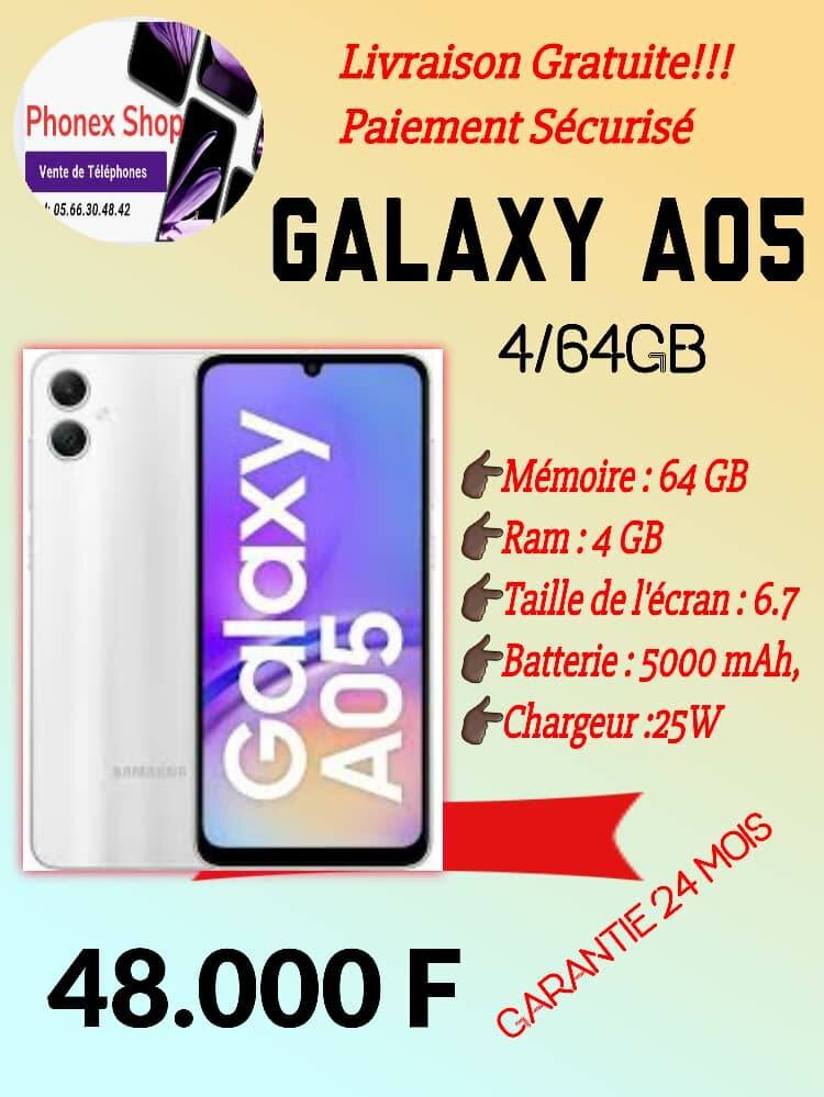 Marque : SAMSUNG Nom du modèle : A05 Mémoire : 64 GB Ram : 4 GB Taille de l'écran : 6.7 Batterie : 5000 mAh, Type de chargement : 25W