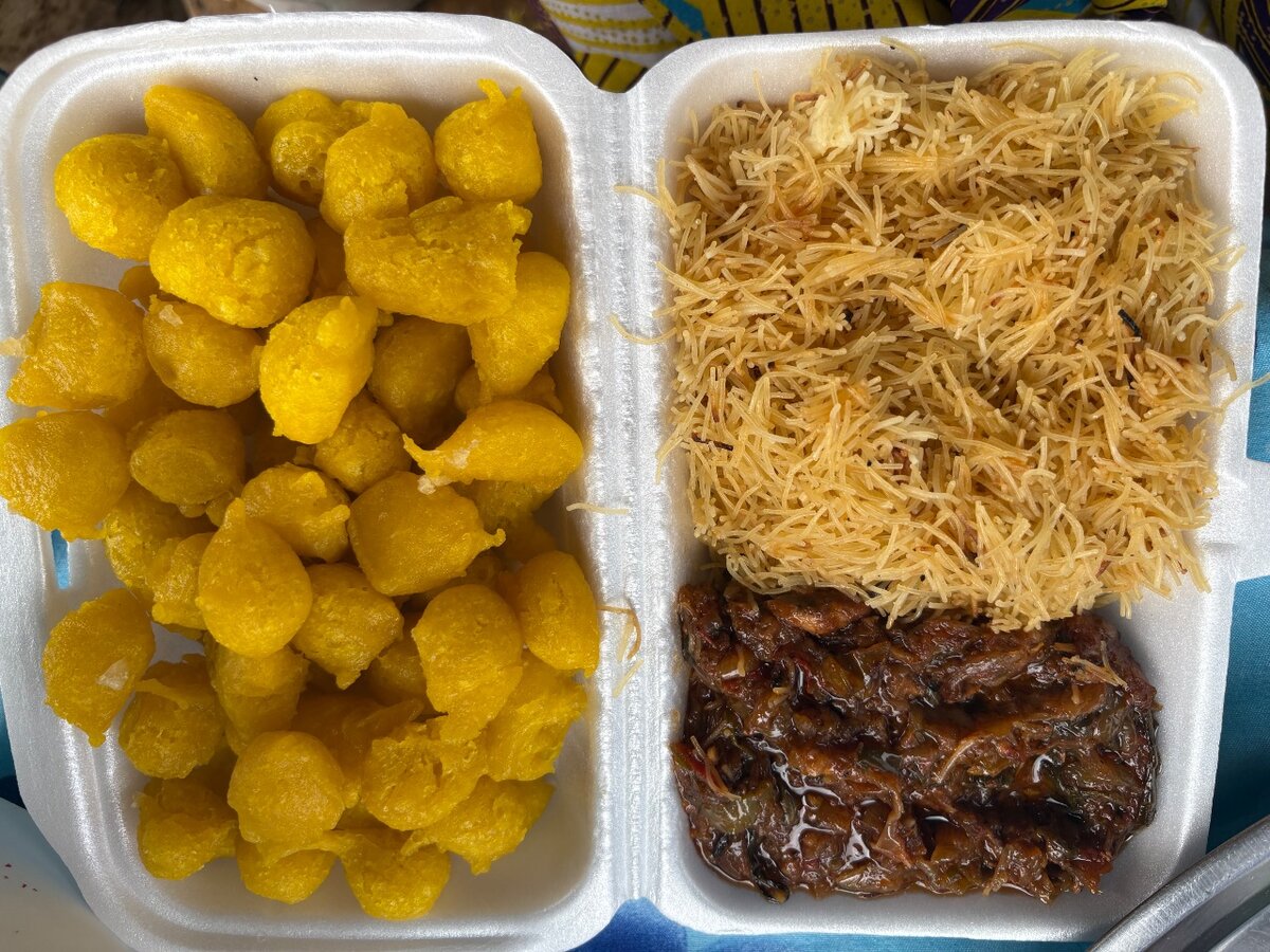 Découvrez un repas fait maison des galettes jaunes avec des vermicelles accompagné de pâtes au poisson