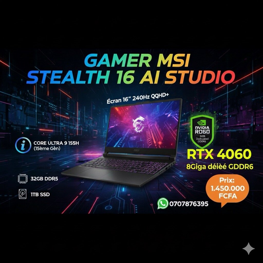 GAMER MSI STEALTH 16 NEUF SCELLÉ Core ultra 7 155h(15éme Génération) Ram 32Giga/Disk SSD 1Tera NVIDIA RRX 4060 8Giga dédiée GDDR6 écran Écran QLED+ 16Pouces