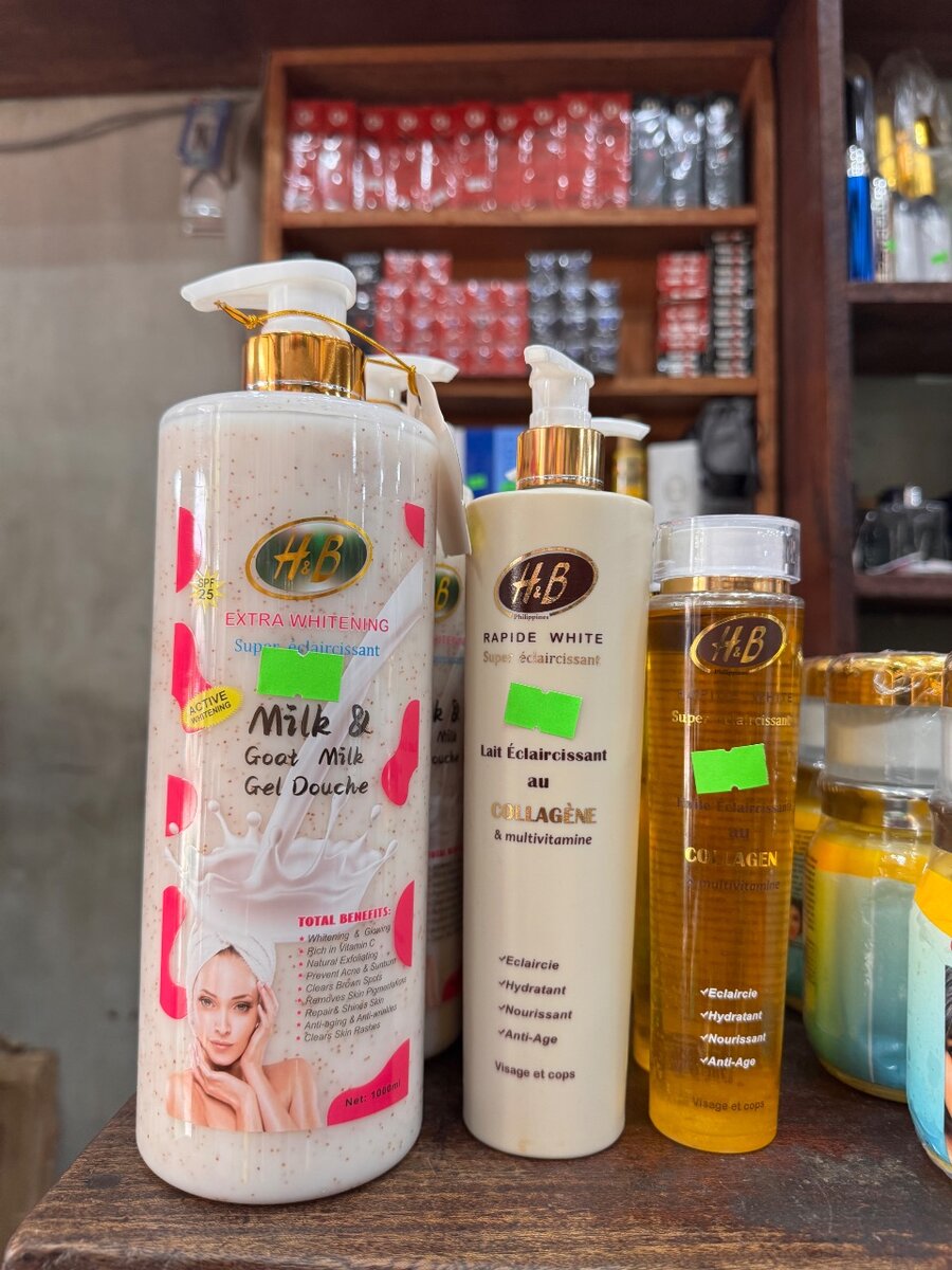 Lait corporel au collagène douce et whitening , huile rest appairante et hydratante super whitening,gel douche au lait gommant et anti-âge traiteur dacne .