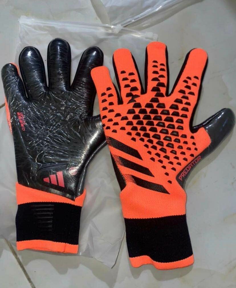 Gants de gardien de but Adidas orange et noir. Résistants et antidérapants pour une performance optimale sur le terrain.