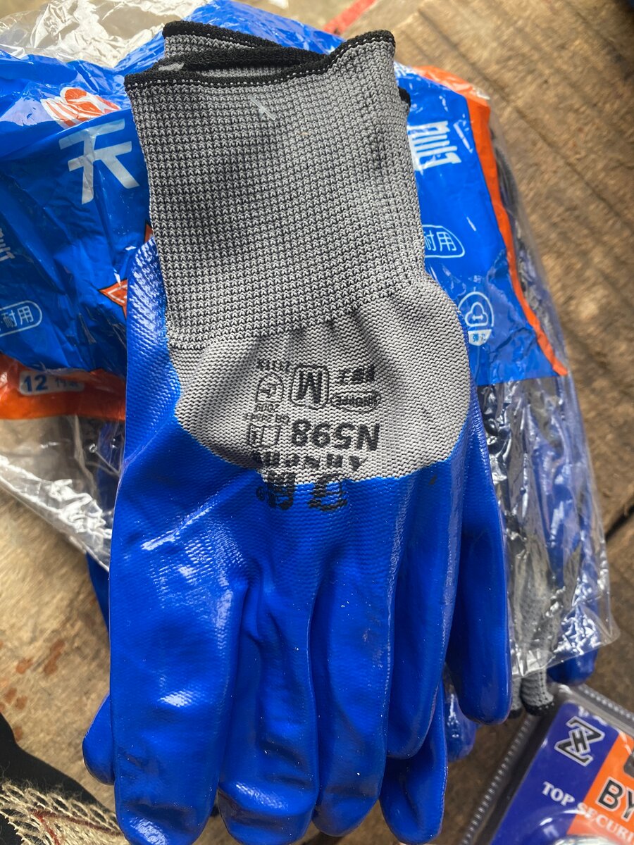 Gants de travail en latex bleu, taille moyenne, résistants et confortables. Idéals pour la construction, le jardinage et les travaux manuels, offrant une excellente adhérence et protection.