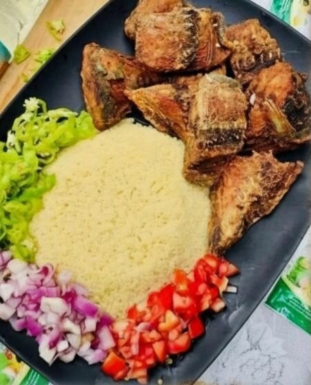 Savourez ce délicieux plat de poisson thon blanc frit accompagné de attiéke moelleux. Parfait pour un repas alléchant, ce plat inclut des légumes frais coupés pour un goût rafraîchissant. Idéal pour les petits déjeuners, les déjeuners en famille ou les dîners spéciaux, offrant un équilibre parfait entre texture croustillante et saveur délicate.