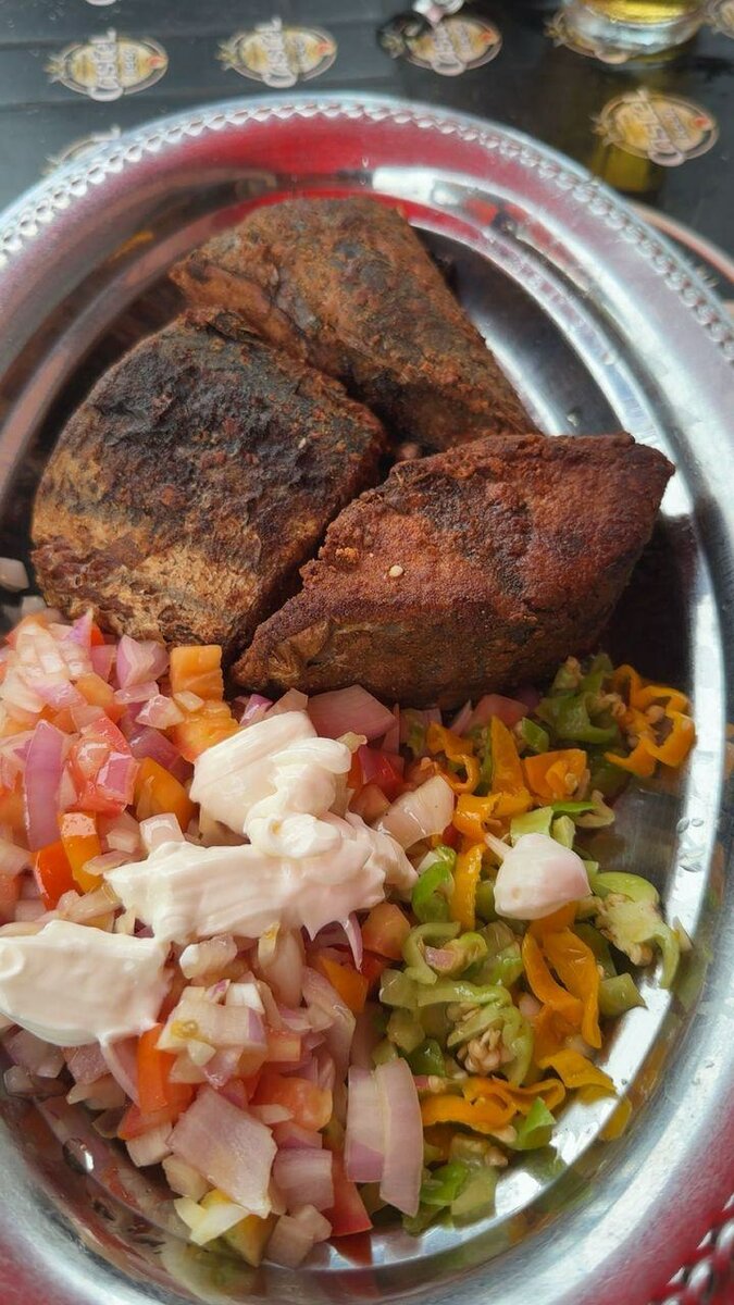 Le plat de garba chez EK 1500f attieké avec 2 poissons avec les condiments