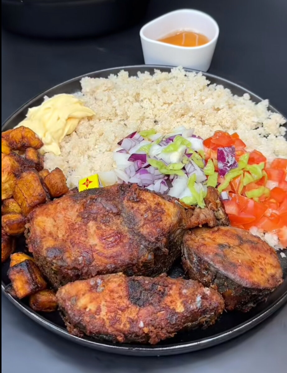 Découvrez le délice du Garba une spécialité composée de poisson thon frit, servi avec de l atieke et agrémenté d'oignons, de tomates fraîches, et de piments verts. Parfait pour un repas exotique et savoureux.