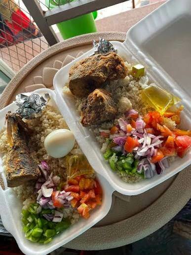 Plat de 1500f: attiéké 200f +tékéwé 100f + poisson 500f+ condiments 200f + aromate 50f+ 2 œufs + jus.