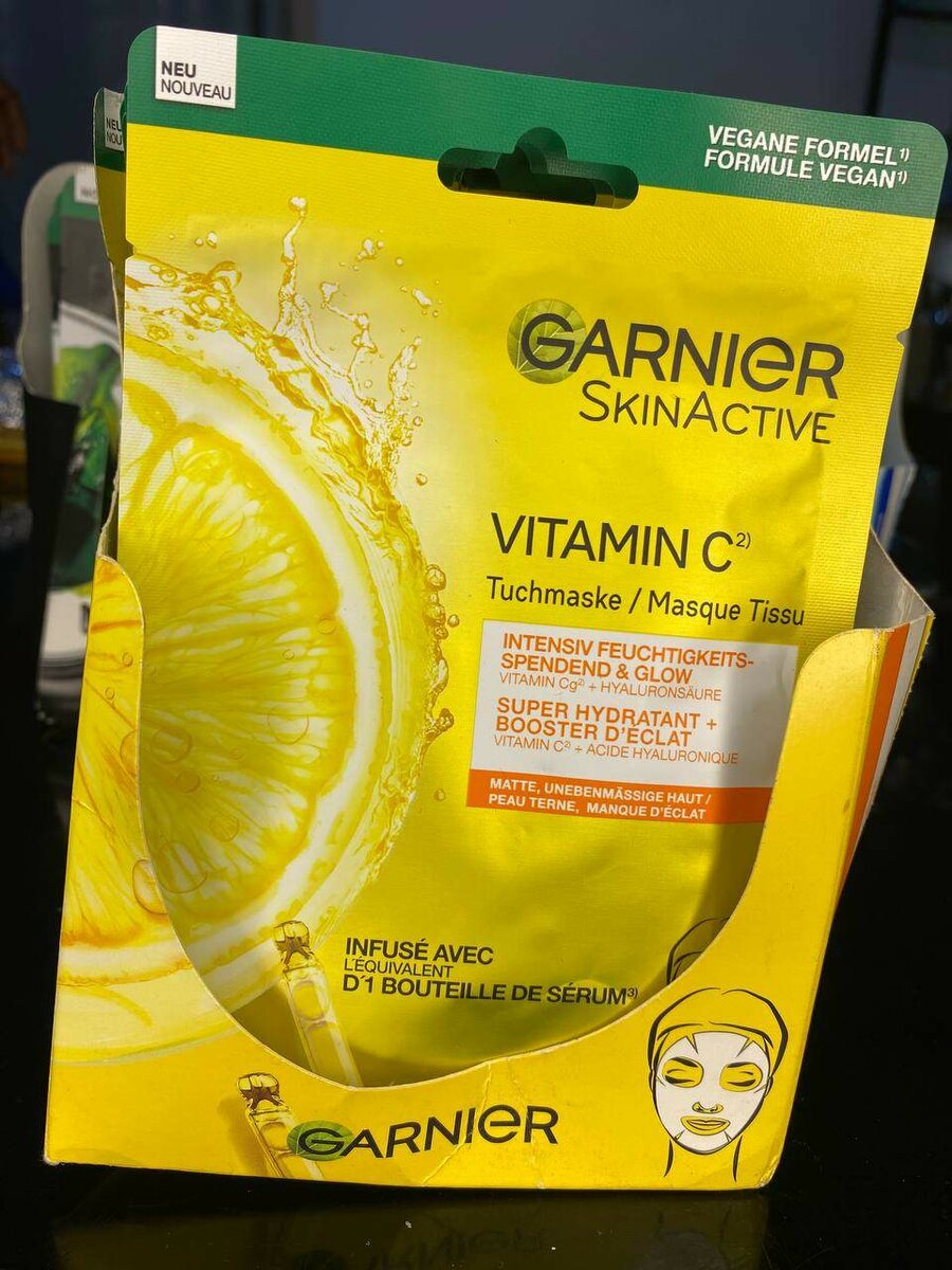 Masque tissu Garnier SkinActive à la vitamine C pour une hydratation intense et un éclat lumineux. Formule végane, idéale pour un teint terne. Utilisation facile en 15 minutes, équivalent d'un sérum complet. Parfait pour revitaliser et illuminer la peau.