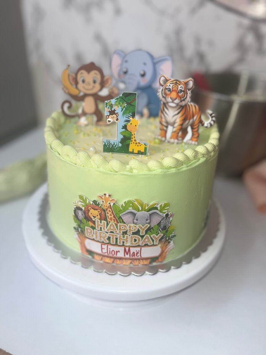 Fêtez en beauté avec ce gâteau jungle coloré et amusant, parfait pour un anniversaire d'enfant! Décoré de motifs d'animaux exotiques et de la touche personnalisée du prénom, c'est la surprise parfaite aux saveurs délicieuses. Idéal pour une célébration mémorable!