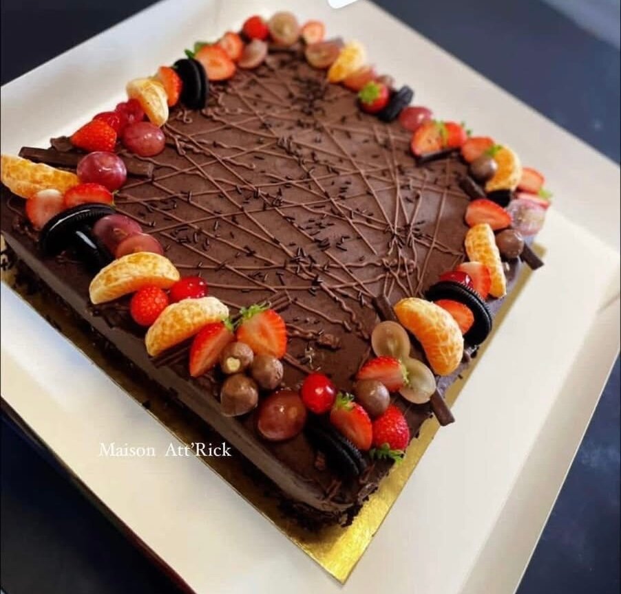Savourez ce délicieux gâteau au chocolat, magnifiquement décoré de fruits frais comme des fraises, des mandarines, et des raisins. Parfait pour les anniversaires ou toute célébration. Une fusion de saveurs riche et exquise.