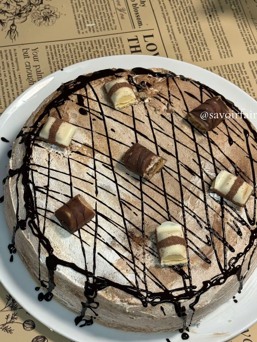 Gâteau moelleux au Kinder fourré de chantilly vanille-choco et de Kinder, avec un coulis gourmand et des biscuits croquants. Parfait pour chaque occasion, il allie douceur et saveur intense. Idéal pour les anniversaires et fêtes.