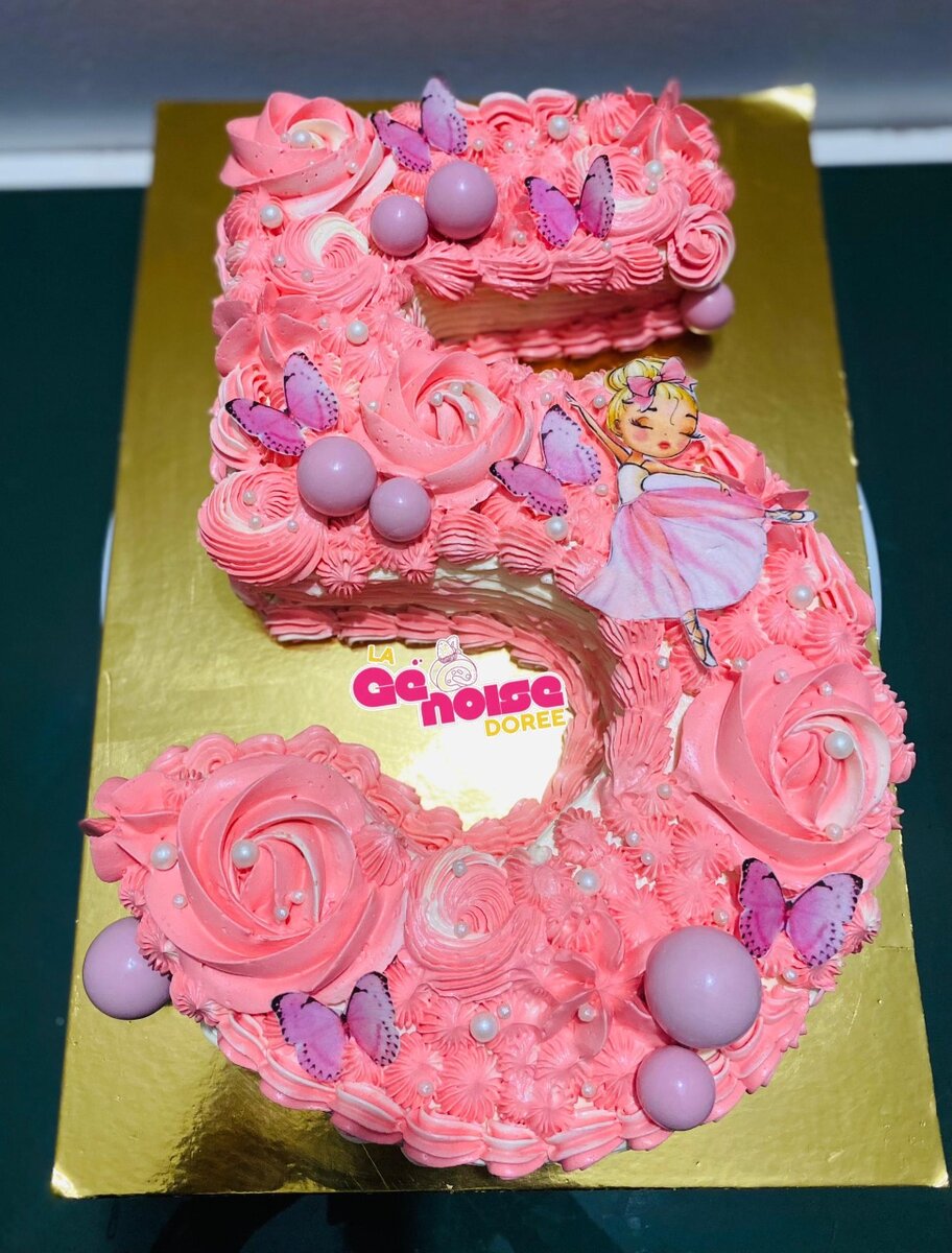 Célébrez les 5 ans de votre enfant avec ce magnifique gâteau d'anniversaire en forme de chiffre. Décoré de motifs roses, papillons et une figurine de princesse, il est idéal pour une fête magique. Faites de ce moment un souvenir sucré et inoubliable.
