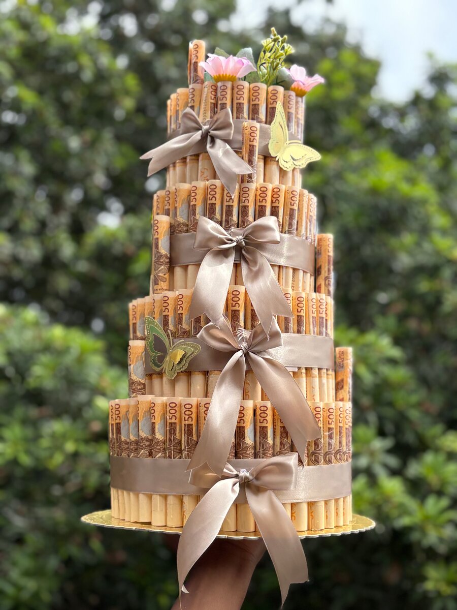 Étonnez vos proches avec ce gâteau unique composé de billets joliment organisés et agrémenté de fleurs délicates. Idéal pour les célébrations spéciales et les surprises mémorables. Une touche de luxe et d'originalité pour toutes vos fêtes.