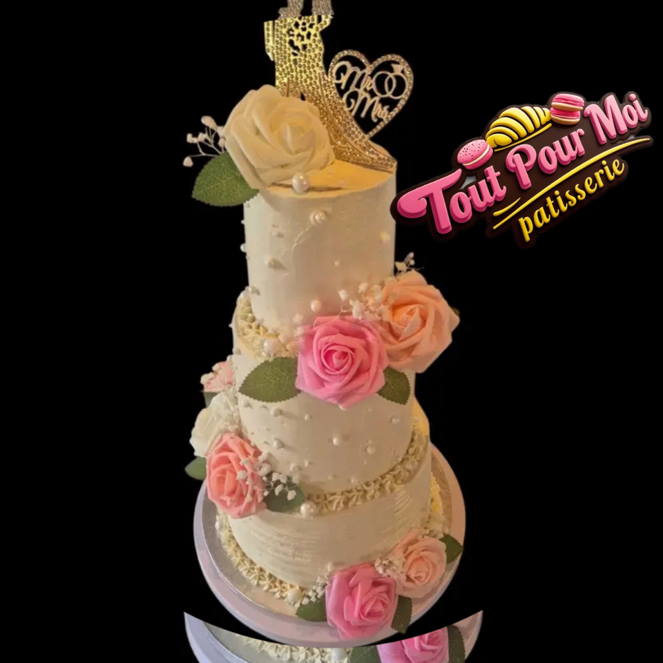 Élégant gâteau de mariage à trois étages, décoré de roses blanches et roses, parfait pour célébrer votre amour. Fait à la main par Tout Pour Moi Pâtisserie, ce gâteau est non seulement magnifique mais aussi délicieux. Idéal pour des célébrations mémorables.