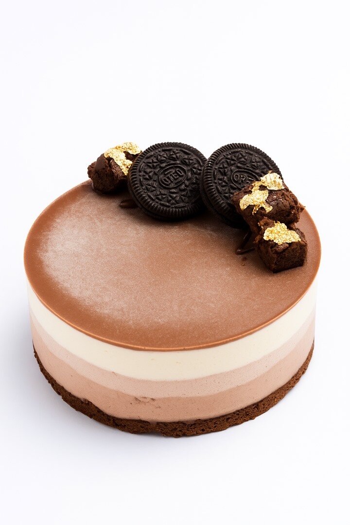 Savourez ce délicieux gâteau mousse 3 chocolats , parfait pour toutes les occasions. Décoré de morceaux de chocolat doré, cet entremets allie onctuosité et croquant. Succès garanti pour vos invités!