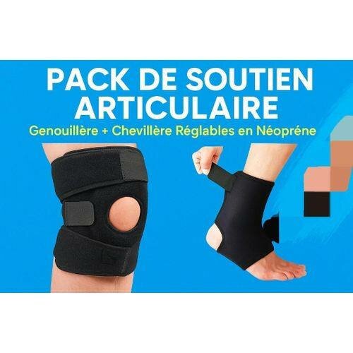 Pack de soutien articulaire en néoprène avec genouillère et chevillère réglables. Idéal pour les sportifs recherchant confort et prévention des blessures. Conception ajustable pour un maintien optimal lors de l'entraînement.