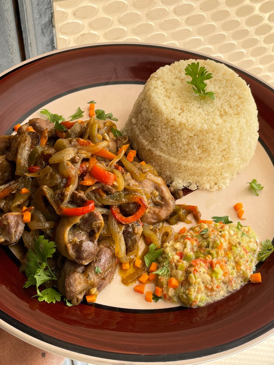 Découvrez notre plat de gésier sauter accompagnée de bananes plantains sucrées et attieke profitez de l'arôme des épices mélangées avec délicatesse, idéal pour les amateurs de plats audacieux. Un délice à partager entre amis ou en famille.