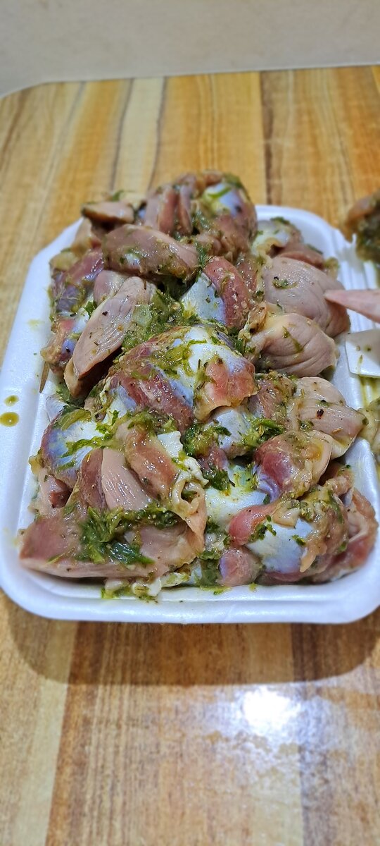 Le kg de gésiers importés est nettoyé et assaisonné aux epices locales ( persil,ail, poivre, ail, gingembre, sceleri, etc.). Le kg est à 3.000 F
