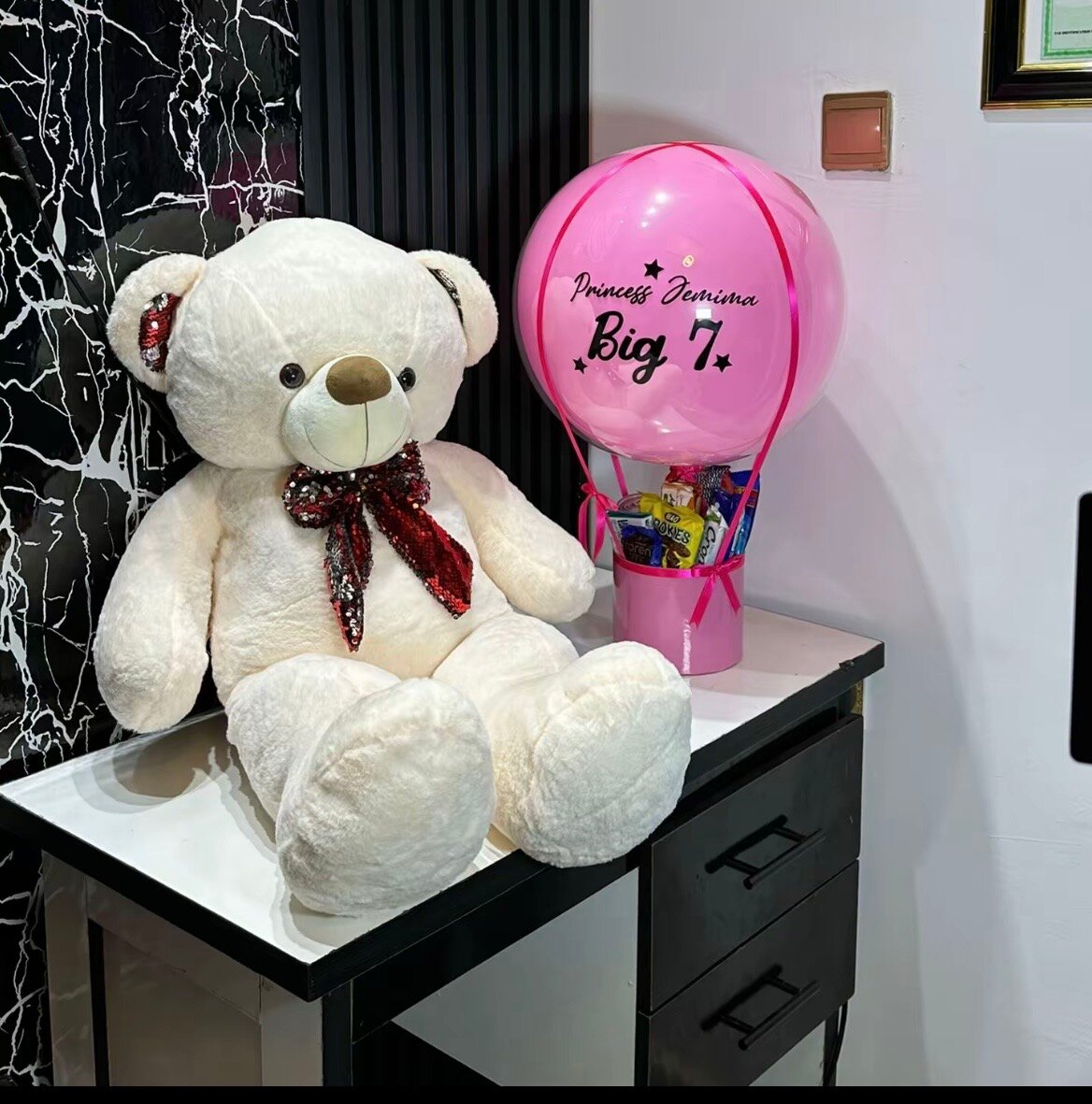 Make their day extra special with this adorable giant teddy bear and balloon gift set. Perfect for birthdays or special occasions, the cuddly plush bear and festive balloon arrangement bring joy and smiles. Ideal for children's celebrations.