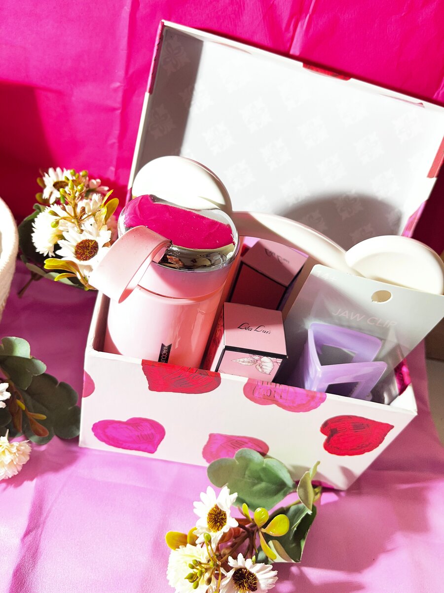 Discover our beautiful gift set, perfect for women who love beauty and self-care. Includes a pink cosmetic bag, makeup brushes, skincare products, and sweet treats.