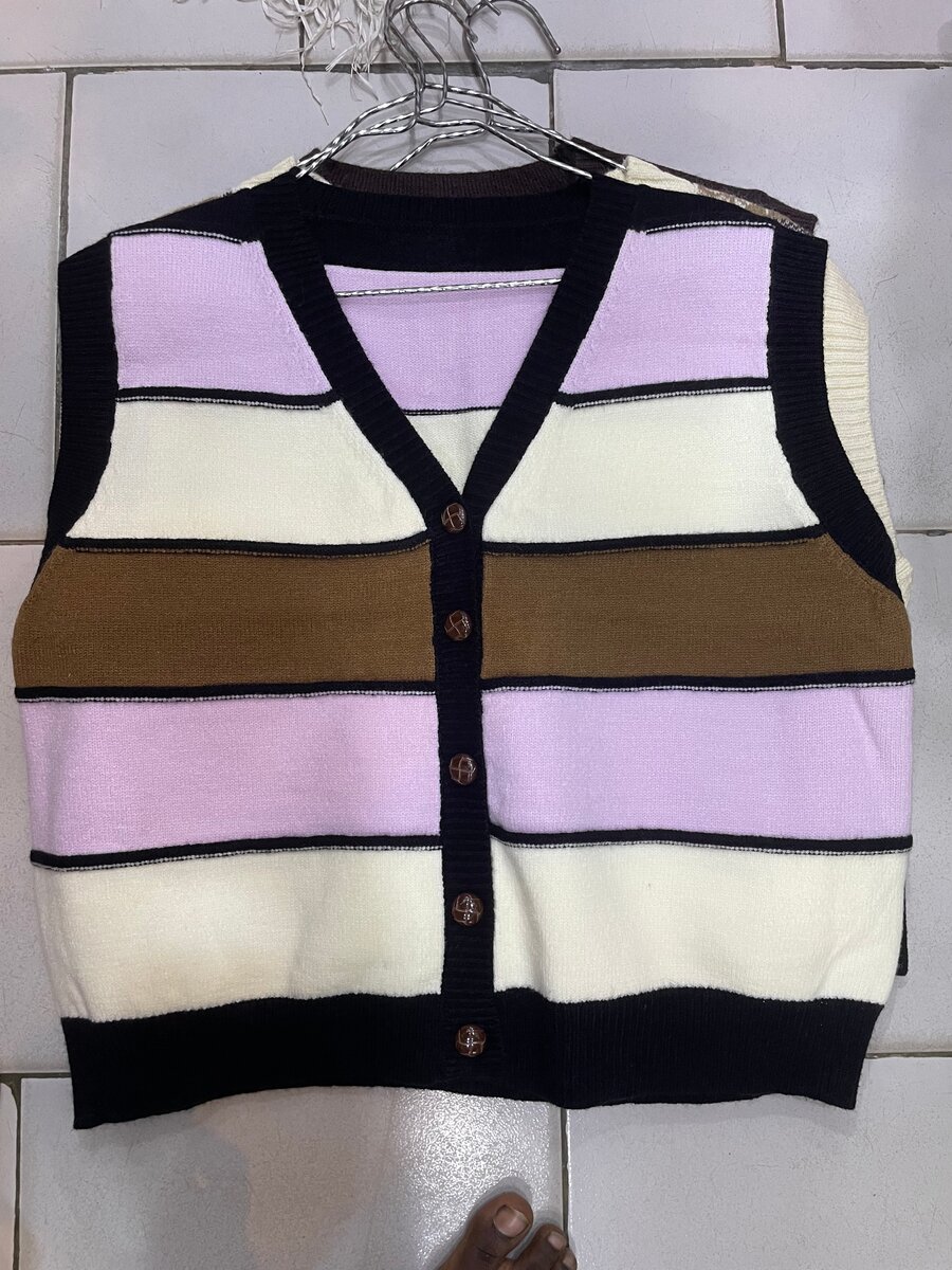 Ce gilet sans manches rayé est parfait pour une touche casual chic. Conçu avec des couleurs pastel et des boutons en bois, il est parfait pour superposer sur une chemise ou un t-shirt. Idéal pour les journées fraîches.