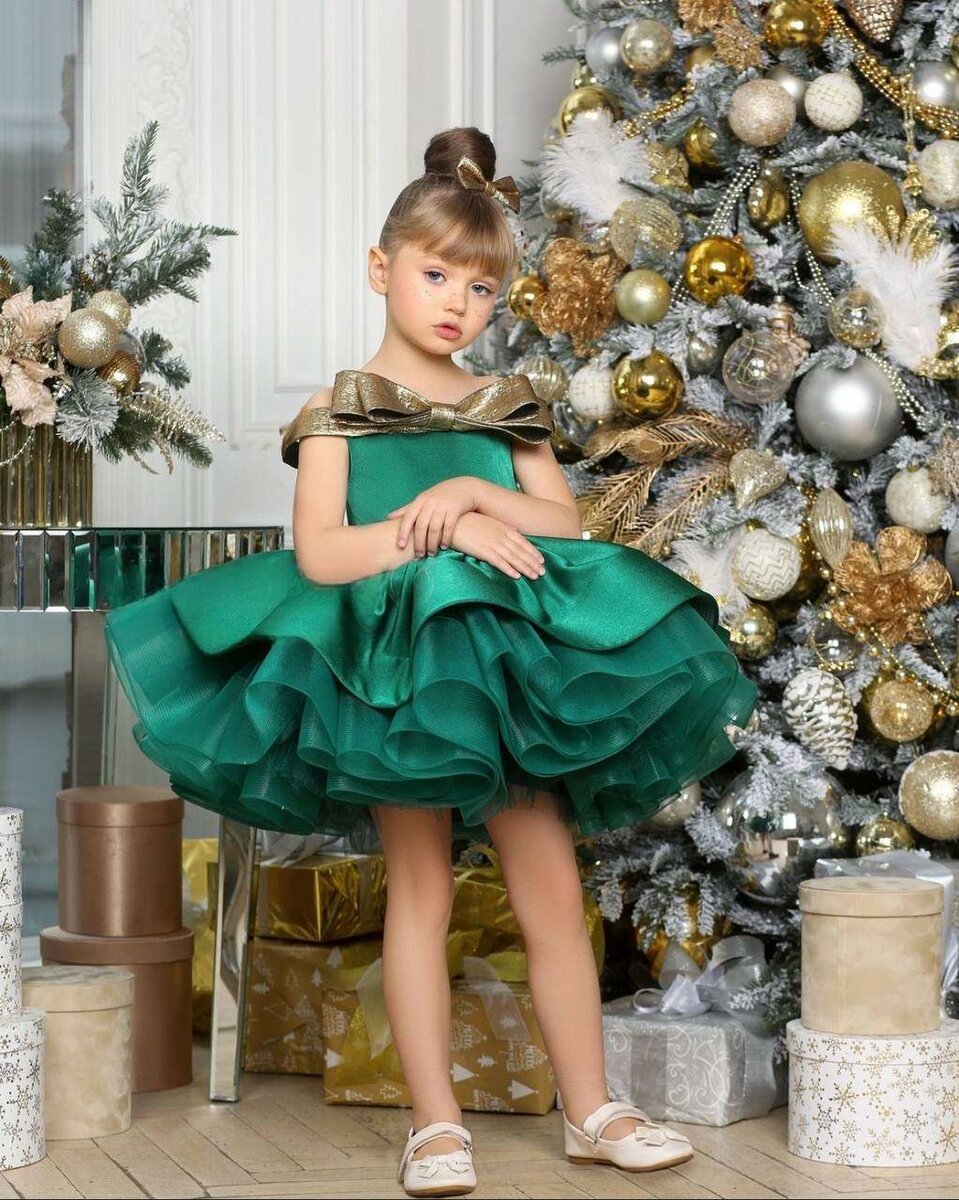 Girl green ball gown is a short knee gown Ranges felm 4-6years The gown comes with a cute bow hair clip