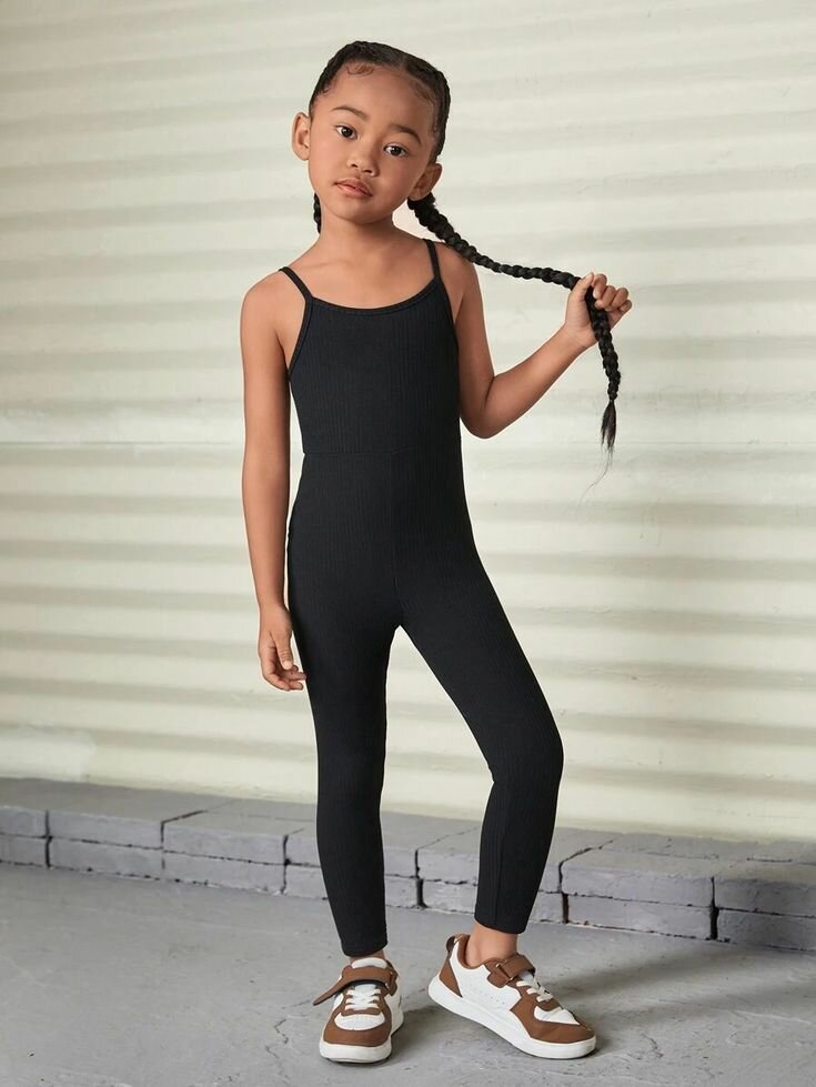 Chic and comfortable black jumpsuit for girls, perfect for active days. Features a sleek design with easy stretch for all-day wear. Ideal for casual outings or dance practice.