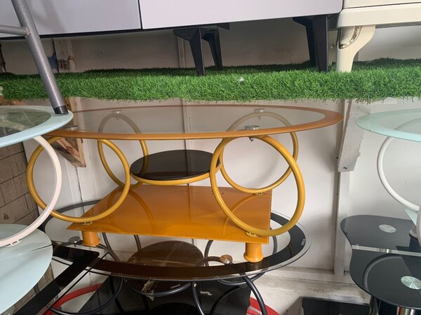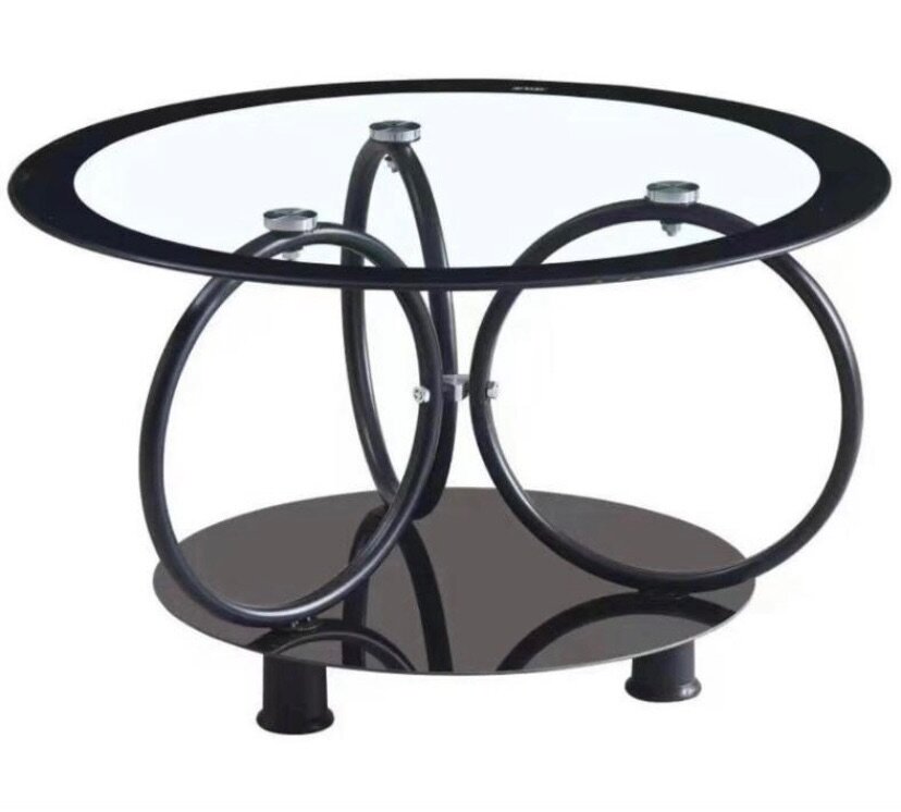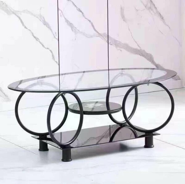 A tempered glass center table with a hard metal ring legs. Very durable.