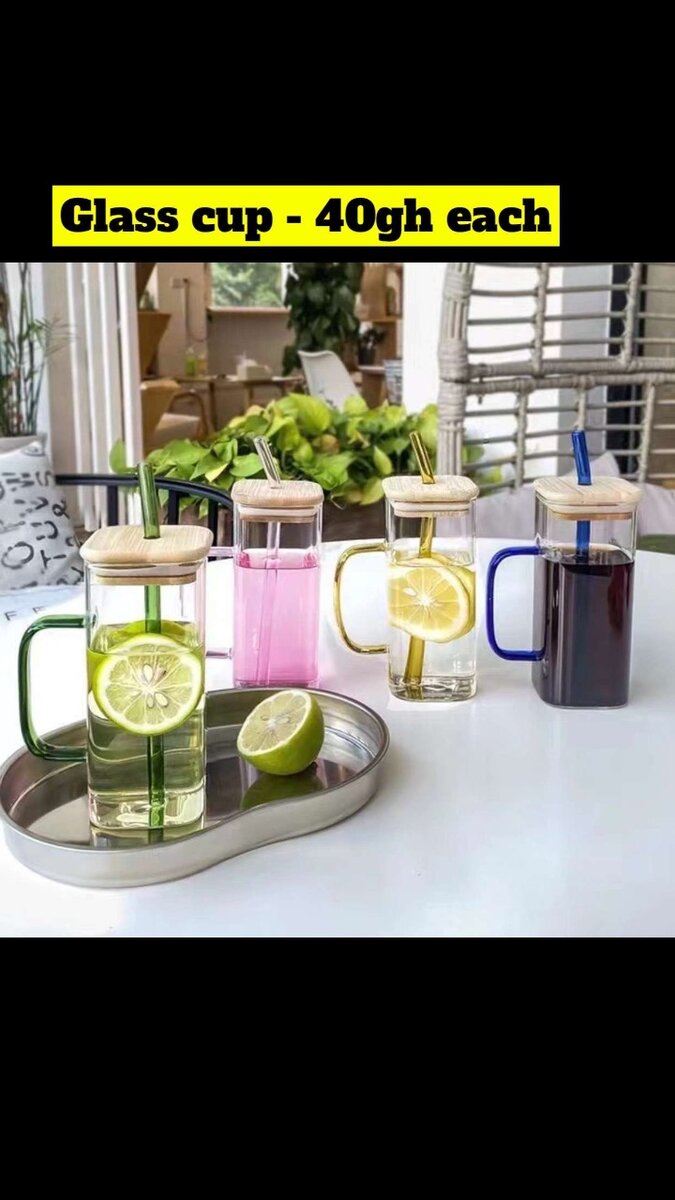 Colored Handle Borosilicate Glass Cup with Straw Hole Bamboo Lid and Glass Straw