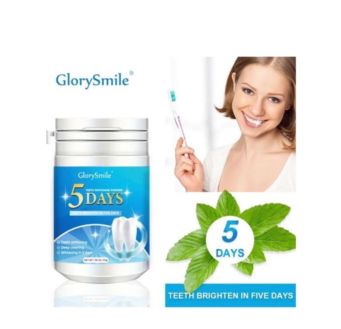 Offrez-vous un sourire éclatant avec la poudre blanchissante GlorySmile en 5 jours. Formulée avec du menthol pour une haleine fraîche et du carbonate de calcium pour renforcer vos dents. Profitez d'une formule douce et non irritante. Idéale pour un usage quotidien, elle élimine les taches et favorise la santé dentaire.