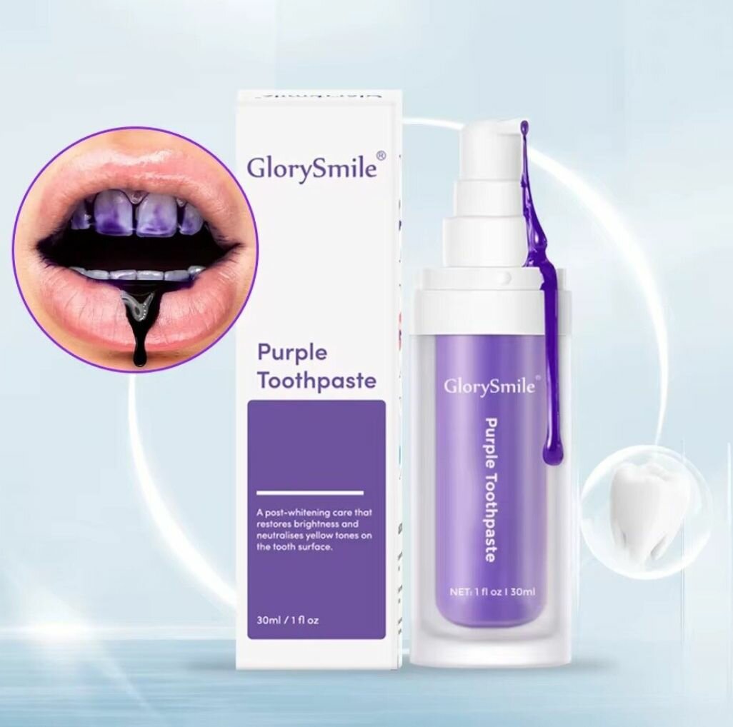 Découvrez le dentifrice violet GlorySmile pour un sourire éclatant. Formule innovante pour blanchir et protéger vos dents. Facile à utiliser, goût frais.