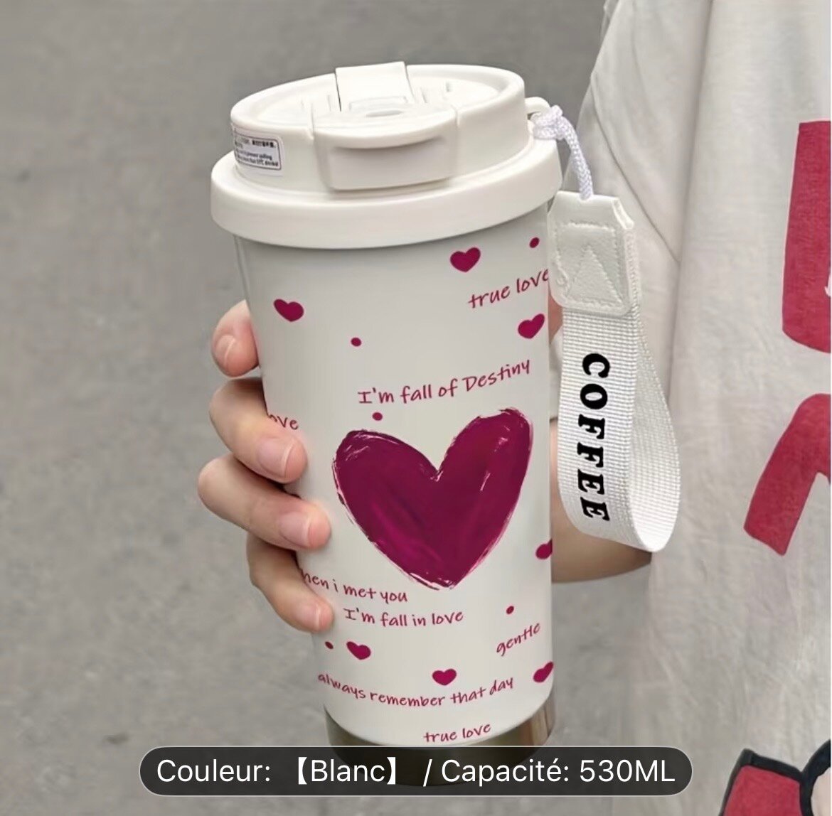 Découvrez notre gobelet thermos de 530ml, idéal pour conserver vos boissons chaudes ou froides. Avec des motifs modernes de cœur et un design pratique, il est parfait pour les déplacements quotidiens. Son anse permet un transport facile. Un cadeau parfait pour les amateurs de café et de thé!