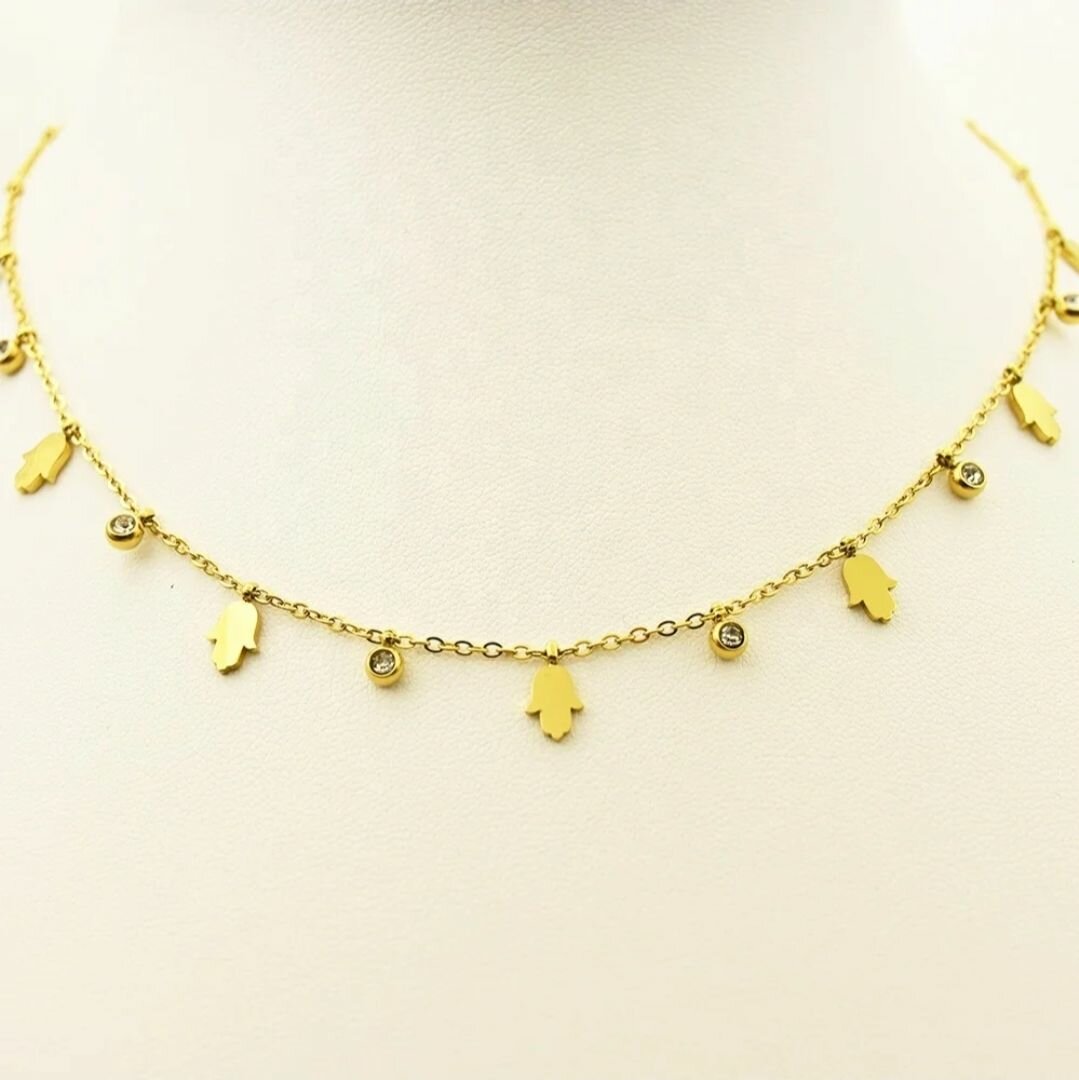 Discover elegance with our Gold Hamsa Charm Necklace, featuring delicate gold charms and sparkling accents. Perfect for adding a touch of sophistication to any outfit, this trendy necklace makes a thoughtful gift or a beautiful addition to your jewelry collection. Wear it for special occasions or everyday glamour.