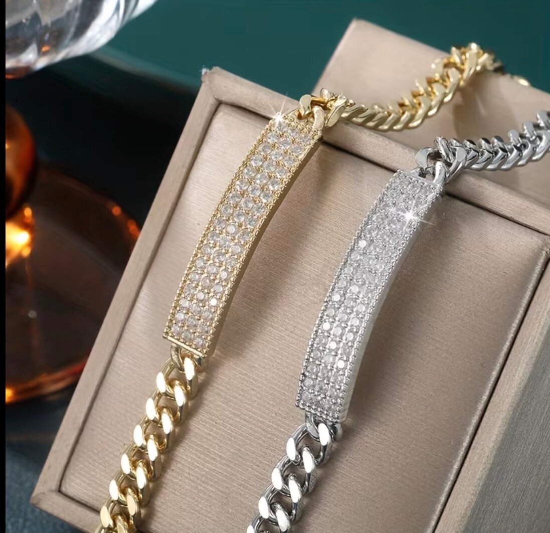 Discover elegance with our gold and silver Cuban link bracelets. Each bracelet features a stunning array of clear, sparkling stones set on a sleek plate, perfect for adding a touch of luxury to any outfit. Ideal for special occasions or elevating everyday wear, these unisex bracelets are crafted for durability and timeless style. Experience the perfect blend of sophistication and fashion with this exquisite jewelry piece.