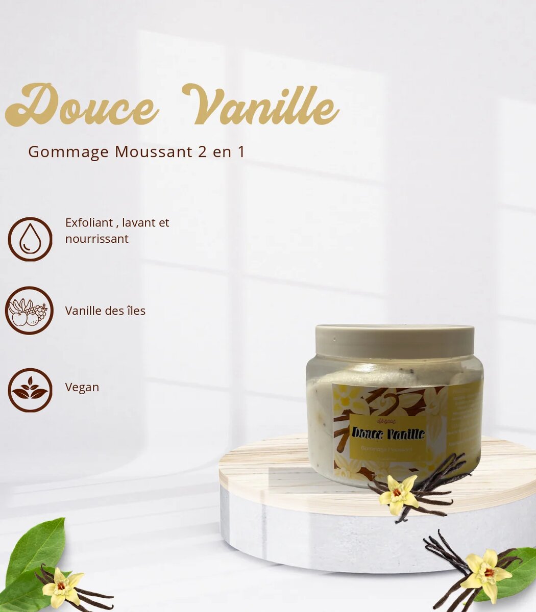 Découvrez le gommage moussant Douce Vanille, une formule 2 en 1 qui exfolie, lave et nourrit votre peau. Enrichi à la vanille des îles, ce produit est idéal pour une peau douce et éclatante. Vegan et respectueux, il transformera votre routine beauté quotidienne. Parfait pour tous types de peau, il apportera une sensation de bien-être et de fraîcheur.