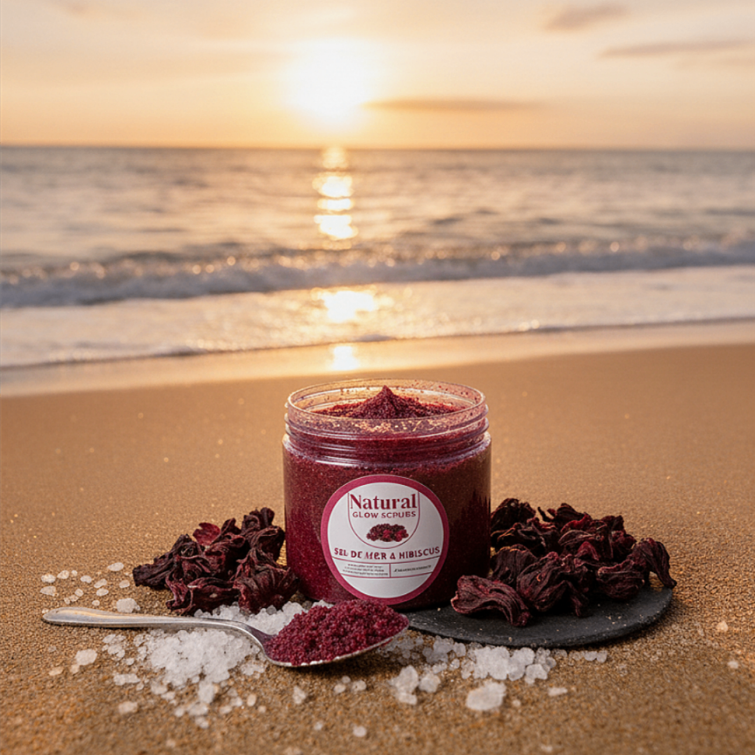 Découvrez le gommage Natural Glow, enrichi en sel de mer et hibiscus, pour une peau éclatante et purifiée. Idéal pour un soin relaxant à domicile.