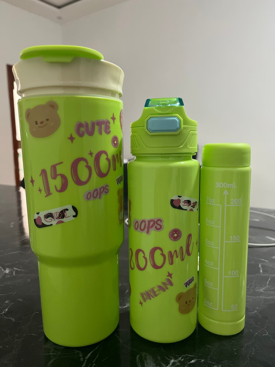 Adoptez ce set adorable de bouteilles en plastique aux couleurs vives et motifs amusants. Comprenant une grande carafe de 1500ml avec poignée, et deux bouteilles de 800ml et 300ml, elles sont idéales pour le bureau, l'école ou les sorties. Légères et faciles à transporter, ces bouteilles conviennent parfaitement pour rester hydraté toute la journée.