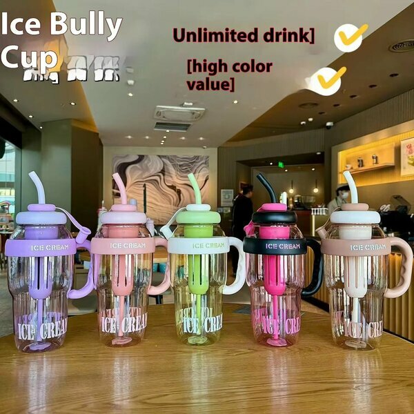 Gourdes 'Ice Cream' translucides avec anse et paille, solides, faciles à nettoyer, 5 couleurs fun. Parfaites pour la maison, le bureau ou les sorties. Un choix pratique et tendance pour tous.