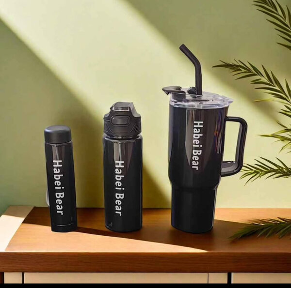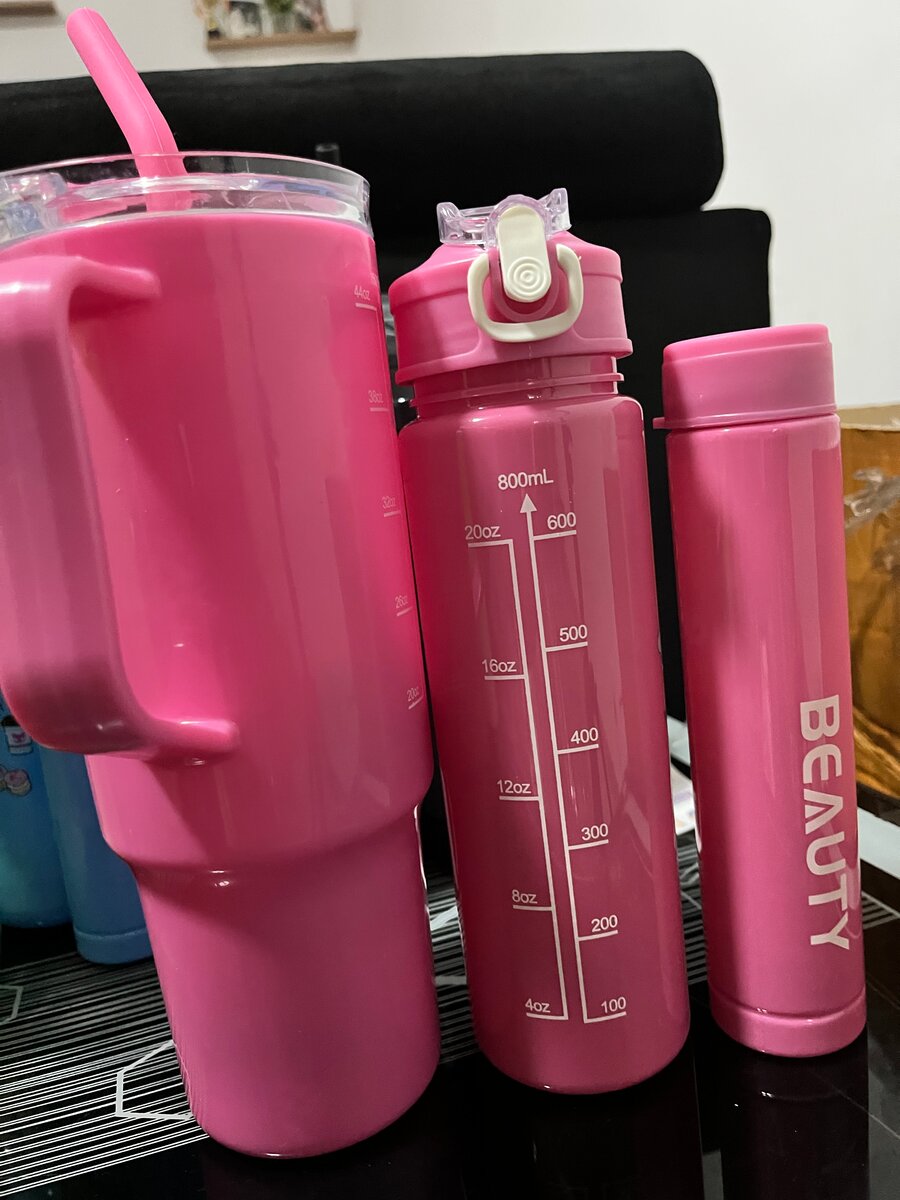 Ensemble de trois bouteilles d'eau élégantes rose pour hydratation quotidienne. Comprend une bouteille graduée, un gobelet avec paille, et un thermos. Idéal pour le sport, le bureau, ou la maison. Conception en plastique durable et design moderne.