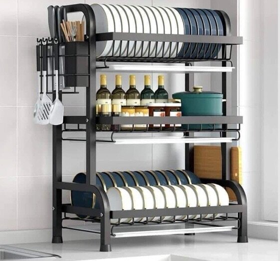 Optimisez votre espace avec cet égouttoir à vaisselle à 3 niveaux. Conçu pour contenir assiettes, bols et verres, il est doté de crochets pour ustensiles. Sa structure robuste maximise le rangement et l'organisation. Idéal pour une cuisine moderne.