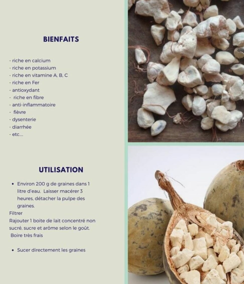 Découvrez les bienfaits des graines de baobab séchées, riches en calcium, potassium et vitamines. Utilisation simple : macération dans l'eau pour créer une boisson nutritive. Idéal pour votre bien-être quotidien.