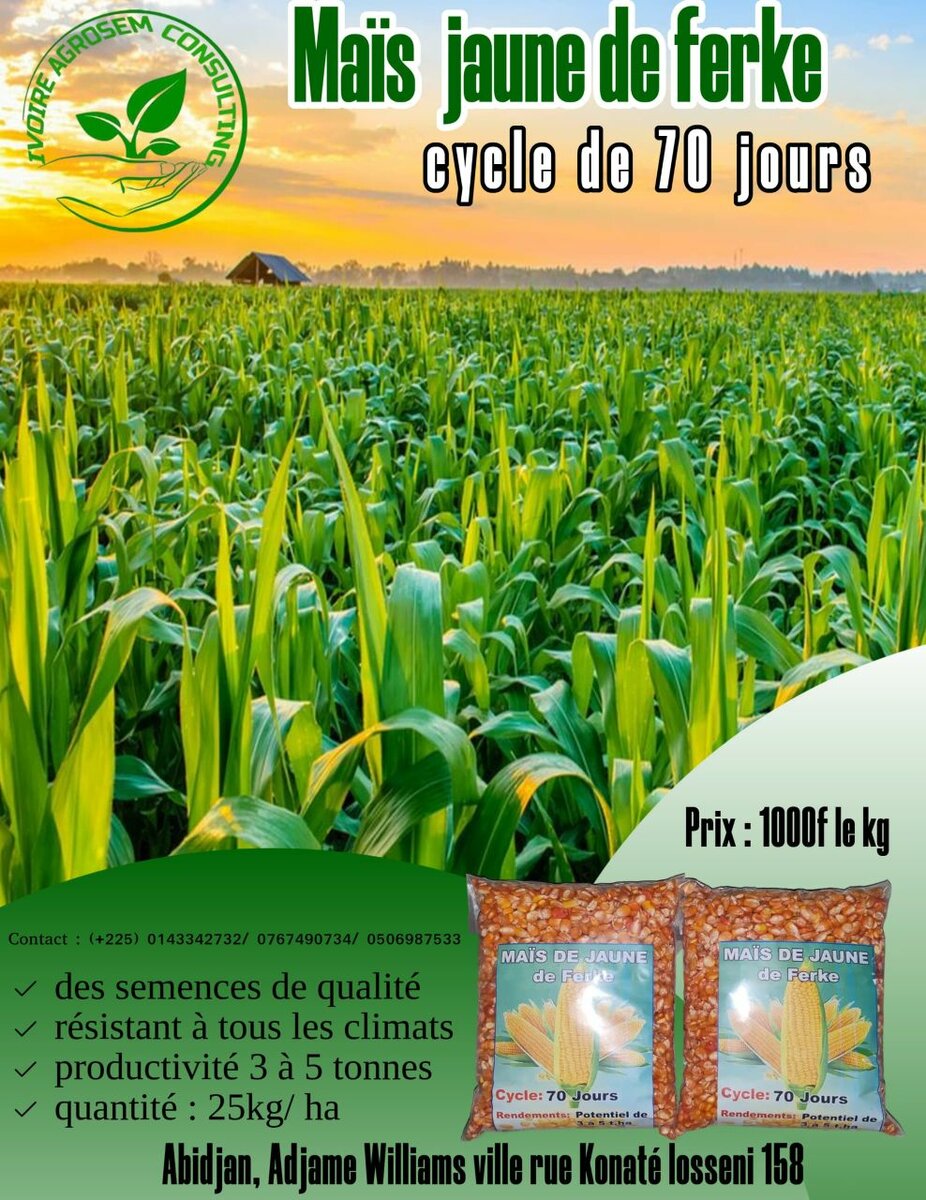 Découvrez nos graines de maïs jaune Ferke, résistantes à tous les climats et avec une productivité de 3 à 5 tonnes. Idéales pour une production rapide en 70 jours. Parfait choix pour les agriculteurs cherchant efficacité et qualité.