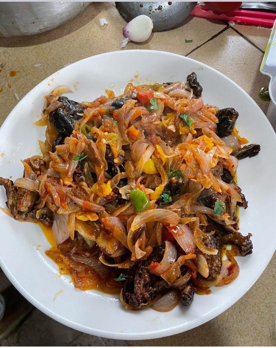 Délicieux plat de légumes cuits combiné au grenouilles parfait pour un repas sain et savoureux. Mélange d'oignons, poivrons et autres légumes, assaisonné d'épices aromatiques. Idéal avec un accompagnement de riz ou à déguster seul.