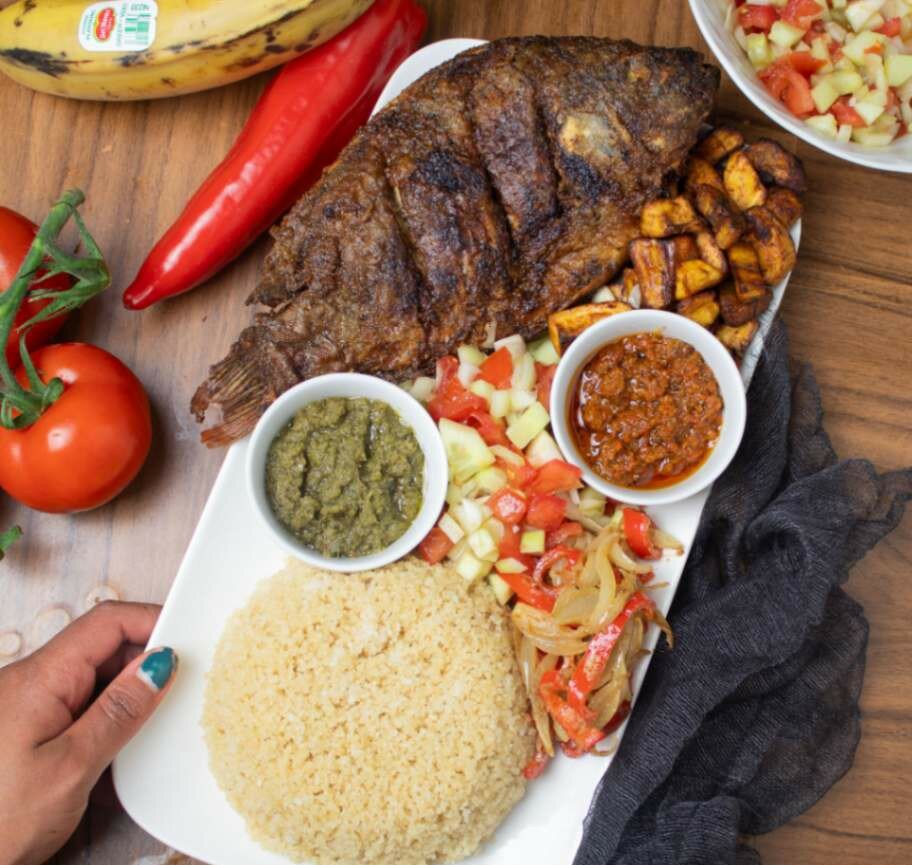 Dégustez ce délicieux plat de poisson braisé servi avec de l'attiéké, avec un piment pour accompagner le poisson.