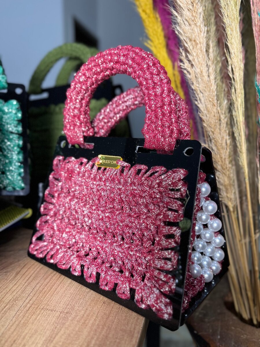 Découvrez ce sac à main tricoté élégant, parfait pour ajouter une touche unique à votre tenue. Fait à la main avec des détails en perles, il allie style artisanal et praticité. Idéal pour les occasions spéciales ou pour sublimer votre style quotidien.