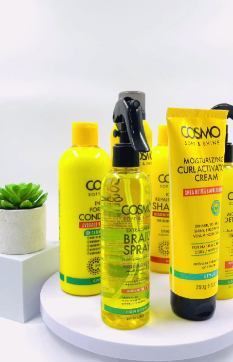 👉🏽COSMO KERATIN SHAMPOO 👉🏽COSMO INTENSE CONDITIONER 👉🏽 COSMO OLIVE OIL SHEEN SPRAY 👉🏽COSMO BRAID SPRAY 👉🏽MOISTURIZING CURL ACTIVATOR CREAM 👉🏽COSMO MOISTURIZING DETANGLING SPRAY