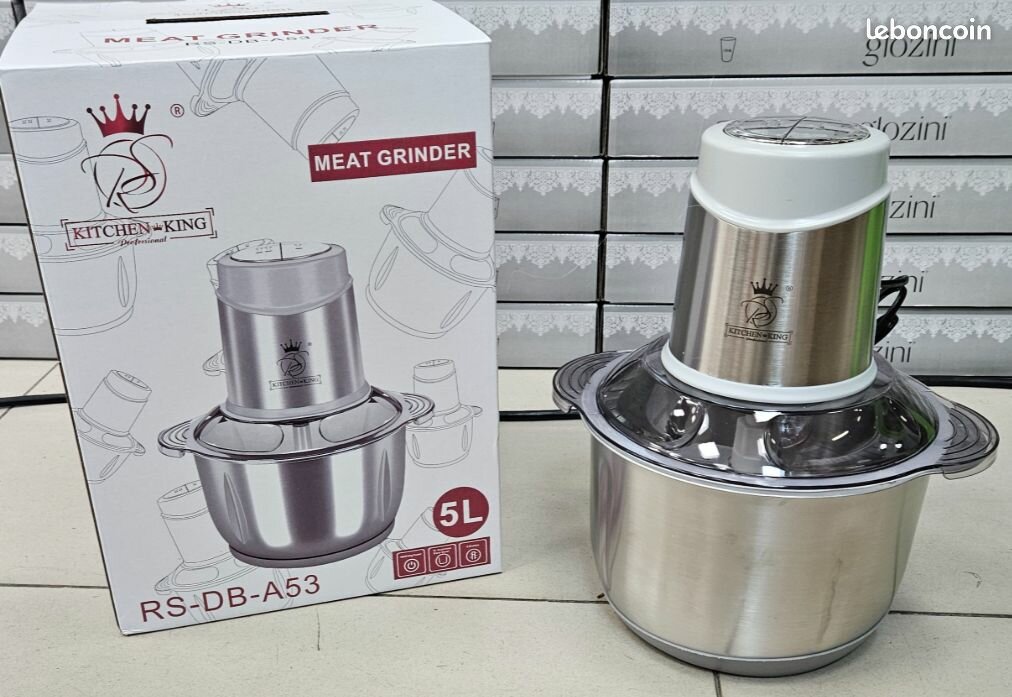 Découvrez le hachoir à viande Kitchen King RS-DB-A53, avec un bol en acier inoxydable de 5L. Idéal pour préparer viandes, légumes et plus encore.
