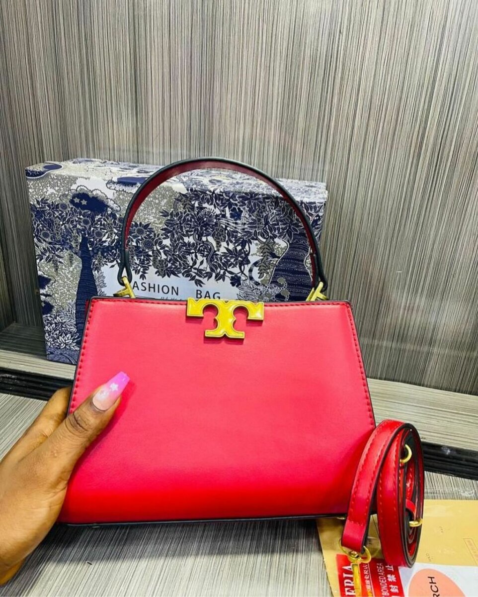 Ensemble femme : jeans, haut rouge et sac à main